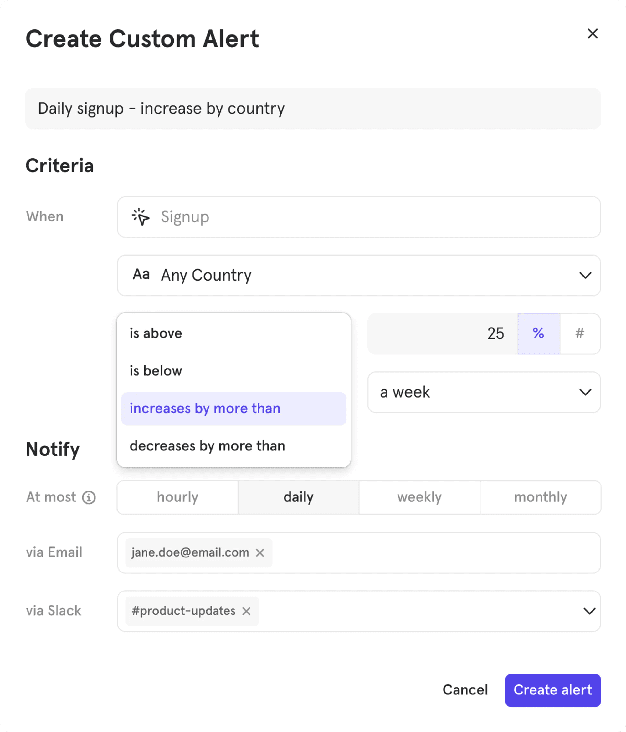 Create an alert for your Insights and Funnels reports and be notified when report conditions reach certain thresholds. Alerts are sent as an email or Slack message and can be sent to multiple users. To create an alert, follow these steps:
